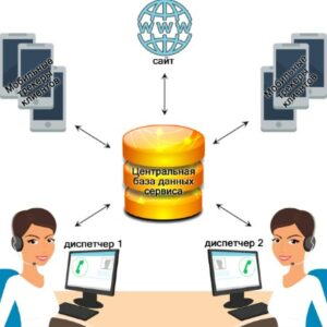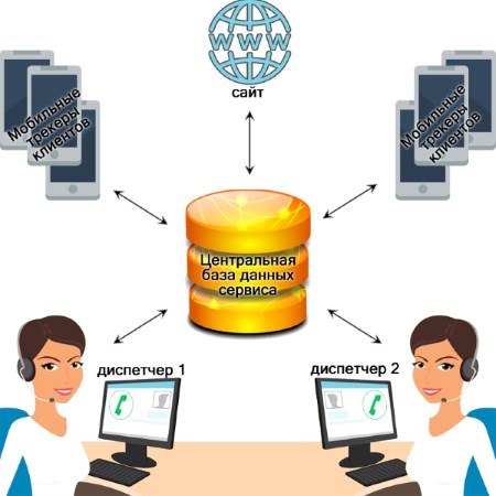 Наша система предназначена для диспетчеризации, то есть для управления сервисными службами предприятия, удаленными специалистами, а также автотранспортом предприятия. Система служит для учета задач, поступающих из различных источников. Она позволяет отследить этапы выполнения заданий и степень удовлетворенности заказчиков. Система отслеживает местоположение мобильных сотрудников, транспорт предприятия и передаёт эти данные на диспетчерский пункт. Общая схема работы сервиса выглядит следующим образом: