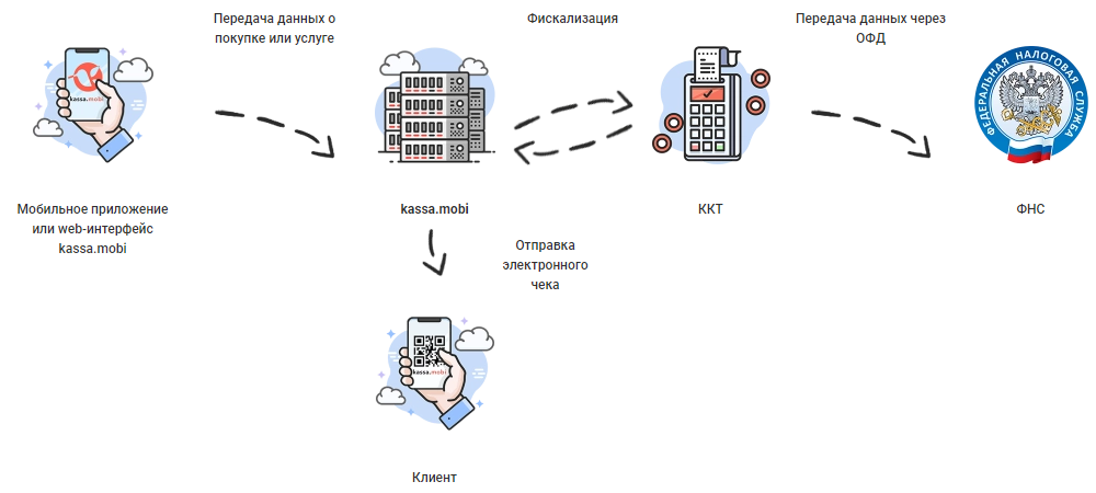 Удаленная фискализация позволяет пробивать кассовые чеки, не имея на месте расчетов физической кассы, а Ваши клиенты могут получить чеки любым удобным способом: в официальном приложении ФНС, на электронную почту или через наш сервис. Все данные о кассовых чеках хранятся в сервисе kassa.mobi в течение года с момента фискализации!